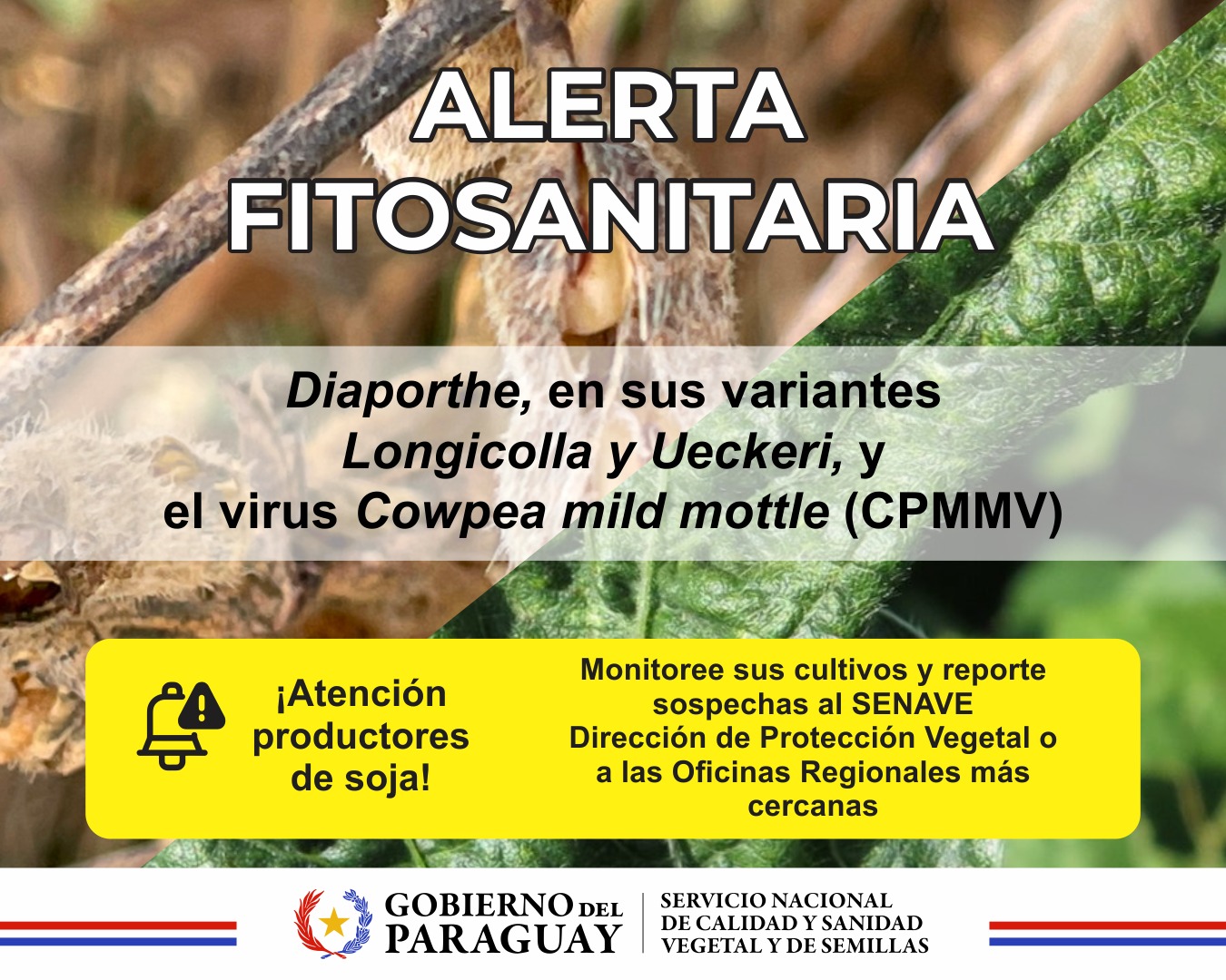 El Servicio Nacional de Calidad y Sanidad Vegetal y de Semillas SENAVE, alerta a productores de soja sobre la presión de ingreso de plagas dañinas para el cultivo del mencionado rubro, y recomienda el monitoreo constante para aplicar las medidas de control fitosanitario y reporte inmediato ante síntomas sospechosos, considerando que las mismas se encuentran en la región.
